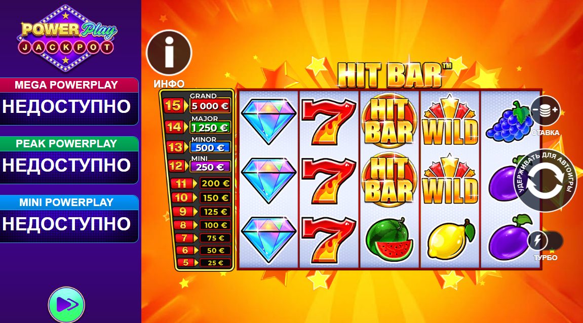 To start playing Hit Bar PowerPlay Jackpot, simply set your bet and spin the reels. The game features a classic slot machine design with 5 reels and 3 rows. Match symbols across the paylines to win big!